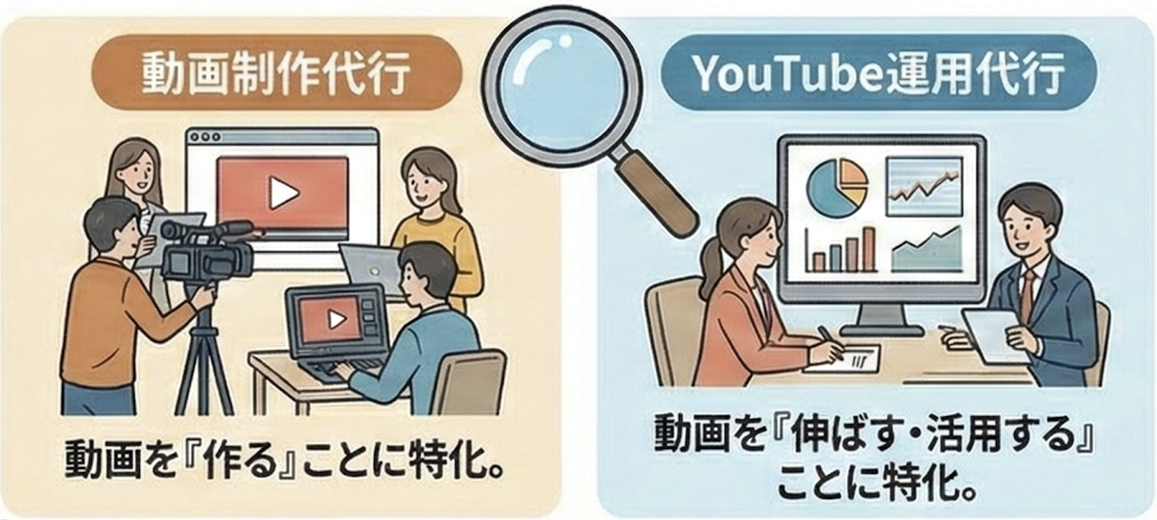運用代行は少人数や個人でも始められるため、会社ごとに支援範囲・実績・運用レベルには大きな差があります。もし自社に合わない会社を選んでしまうと、時間と予算をかけても成果が出ず、「YouTubeは意味がなかった」と感じてしまうケースも少なくありません。